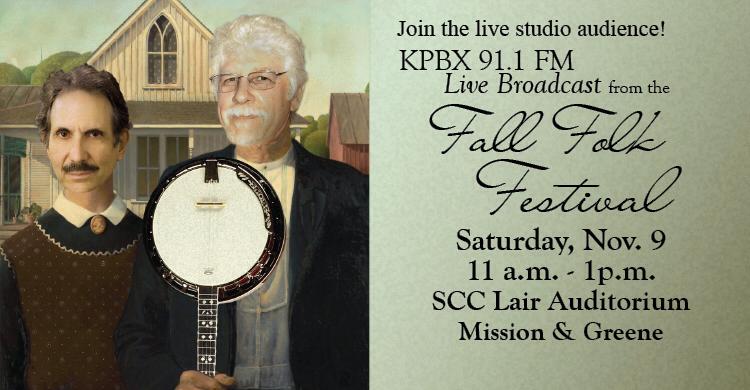 If you know about the Fall Folk Festival (and you really should get to know the Fall Folk Fest!) you know that KPBX, the main station of Spokane Public Radio, holds a live broadcast sampler of the music performers. When I worked there, we looked for creative ways to promote the broadcasts… and got a really crazy idea. How about putting the faces of then-hosts Carlos Alden and Verne Windham onto the artwork of American Gothic? And instead of a pitchfork, holding an instrument? Like Carlos’s favorite, the banjo?