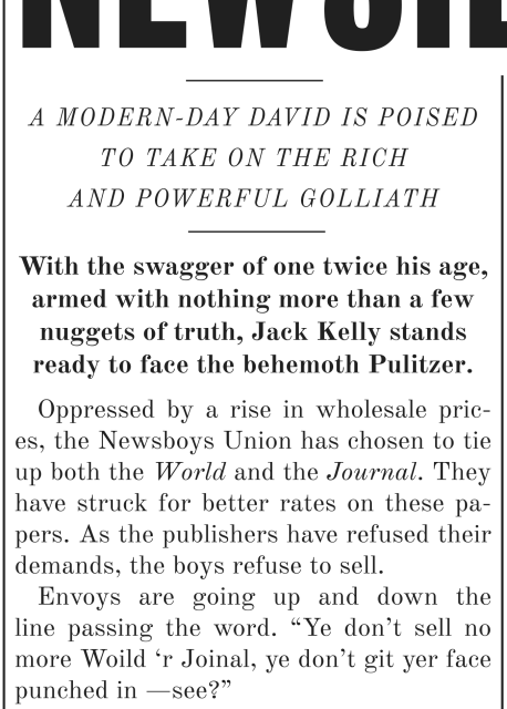 The film/stage show about young newspaper sellers protesting a cost increase is based on a real newsboy strike, and New York newspapers of the day printed accounts of boys pummeling scabs. Even if those accounts are true, they aren’t wholesome enough for a Disney family show. The stage plot paints the boys as victims of the publisher’s thugs. The lead story for the prop paper became a blend of Katherine’s words, a description of the show’s fight scene, and details pulled from the real newspapers.