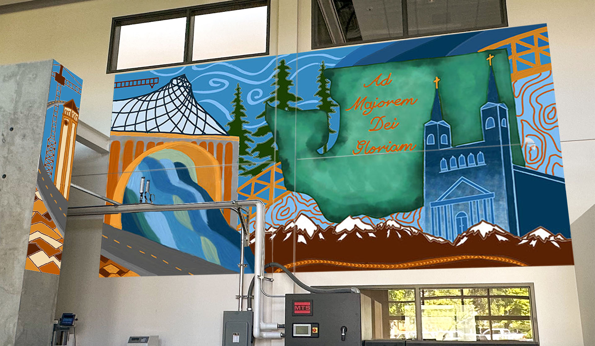 Challenge: Generate excitement about the idea of a Gonzaga Civil Engineering student’s mural design across four irregular surfaces of the Structural High Bay Lab. Encourage student enrollment in the Visual Arts mural painting courses by helping students image what they would bring to life.