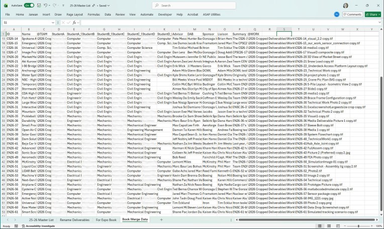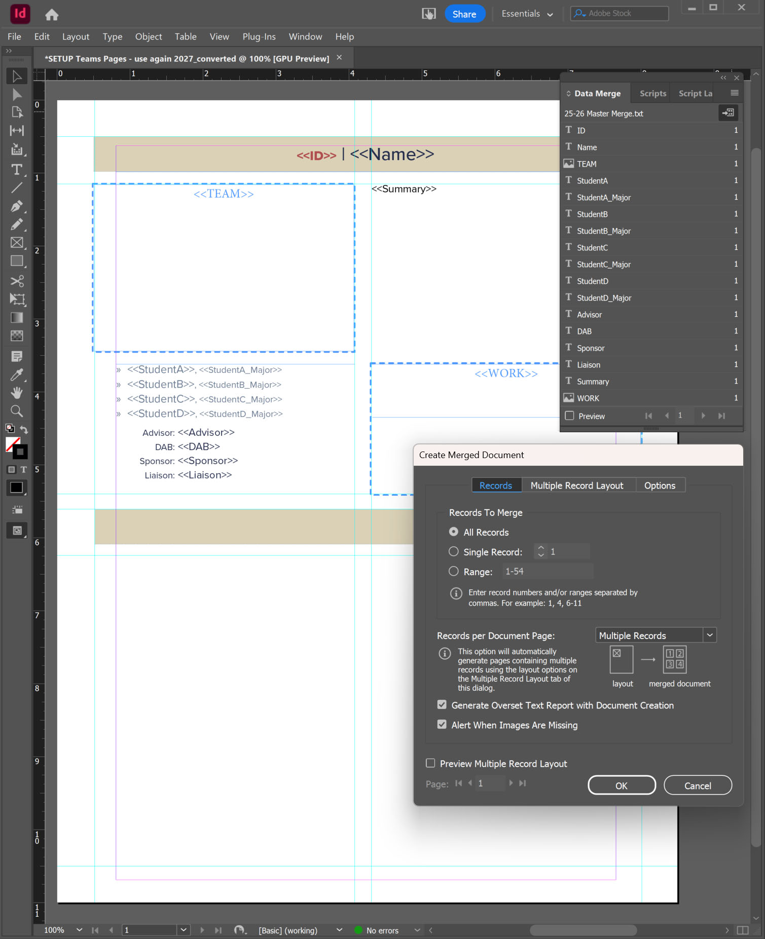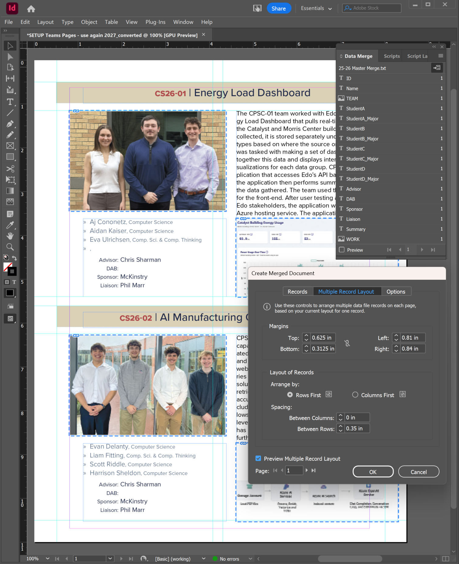 Data Merge: To manage the multiple names, images and summaries of the teams, I prepared a version of the master spreadsheet to use as an InDesign data merge.